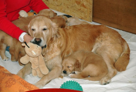 Am 14.und 15. August wurde unsere "Tara vom Schwarzbachtal" von dem Golden Retriever-Rüden "Golden Mountain Spring's Caruso" gedeckt. Wir haben Caruso als sehr souveränen und rassetypischen Hund kennengelernt - ein echt cooler Typ eben - Wir erwarten aus dieser Verpaarung sehr schöne Golden Welpen, die alle Golden-Retriever-Merkmale mitbringen. Dazu zählen das menschenfreundliche und sanfte Wesen, Arbeitsfreude, Gesundheit und natürlich auch das Aussehen mit der golden-typischen Färbung. Zwar bringen beide Zuchtpartner viel Farbe mit, jedoch steht die Farbe der Welpen bei unserer Zuchtplanung für uns nicht im Fokus. Ein guter Hund hat keine Farbe! - und kann dem zufolge weder zu hell noch zu dunkel sein. Die Grenzen setzt uns der Rassestandard.Zu Ihrer Information hier einige Daten und Fotos der Elterntiere: